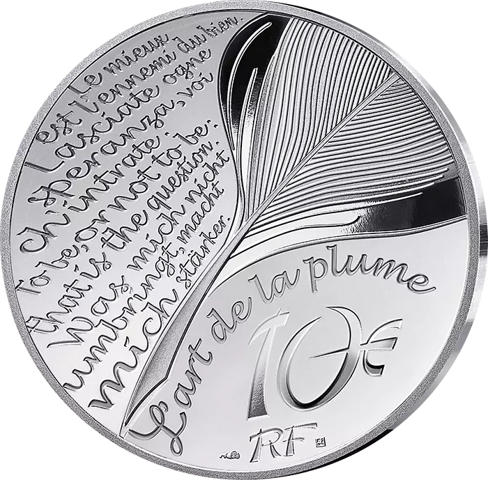 The reverse is common to the entire ?L'Art de la Plume? series. It features a number of emblematic quotes, including Voltaire's ?The best is the enemy of the good?, Dane Alighieri's ?Lasciate ogne speranza voi ch'intrate?, William Shakespeare's ?To be or not to be that is the question? and Nietzsche's ?Was mich nicht umbringt macht mich stärker?. A feather is engraved in the centre of the piece. Below it is the title of the series. The word ?RF? appears at the bottom right of the coin, along with the hallmark of Joaquin Jimenez and the engraving workshop.