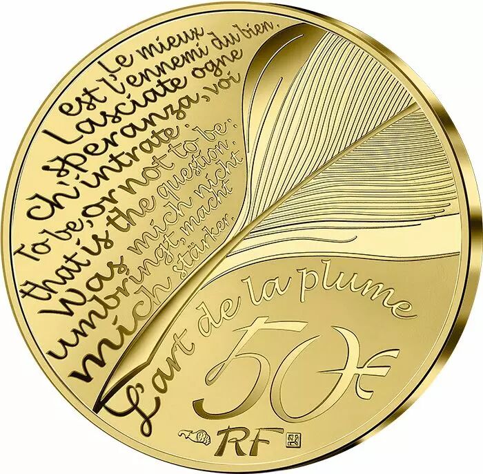 The reverse is common to the entire "L'Art de la Plume" series. It features a number of emblematic quotes, including Voltaire's "The best is the enemy of the good", Dante Alighieri's "Lasciate ogne speranza voi ch'intrate", William Shakespeare's "To be or not to be: that is the question" and Nietzsche's "Was mich nicht umbringt macht mich stärker". A feather is engraved in the centre of the piece. Below it is the title of the series. The word "RF" appears at the bottom right of the coin, along with the hallmark of Joaquin Jimenez and the engraving workshop.