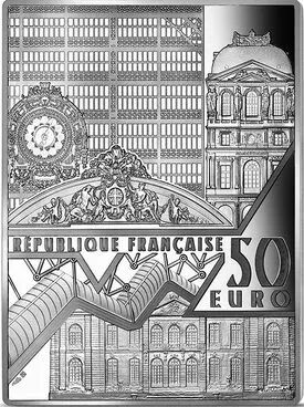 The reverse is common to the series and features a mixture of views of several major French museums: top left is an interior view of the Musée d'Orsay, recognisable by its superb clock. Next to it is a view of the façade of the Louvre, visible from the Cour Napoléon (where the famous pyramid is located). Below these two elements is a fresco on the Hôtel Salé, which houses the Musée Picasso. The lower part of the reverse shows a view of the façade of the Hôtel Biron, now the Musée Rodin. Above this is the famous staircase of the Centre Pompidou. The face value and the words "République Française" are also inscribed on this reverse.
