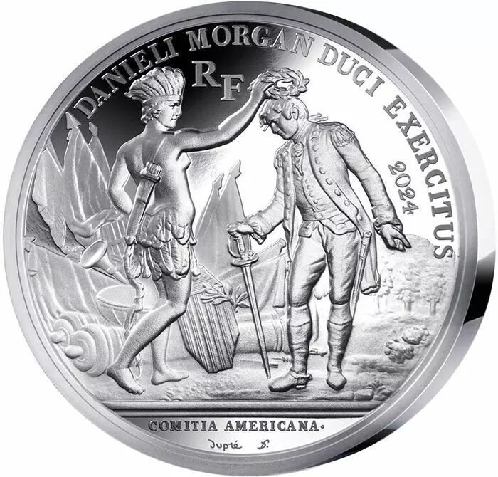 This coin features the graphic characteristics of the medal that was given to Daniel Morgan following the Battle of Cowpens. The original medal which illustrates Daniel Morgan's Victory on the obverse depicts him standing, preparing to be crowned by a Native American queen, an allegory of America; a female figure wearing a short cuirass and a headdress of feathers. The reverse shows the commander-in-chief leading the charge on horseback, followed by his troops on foot and overthrowing the fleeing English adversary. It is signed by the engraver Augustin Dupré, then holding the role of general engraver of the Monnaie de Paris.