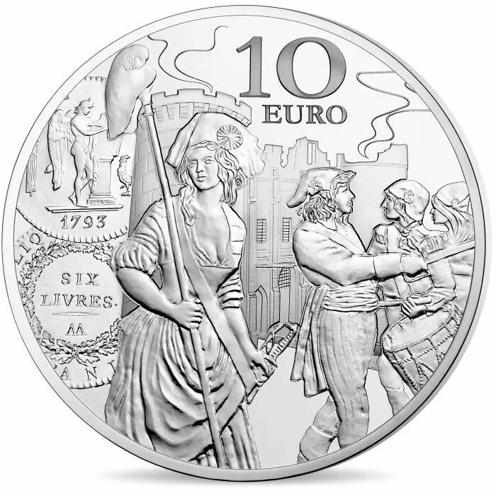 The reverse depicts the revolutionary era with some of its major symbols: the storming of the Bastille, the National Guard (citizen militia, intended to maintain order) and the revolutionaries with their Phrygian cap or their characteristic charlotte. On the left side, there is a reproduction of the face and reverse of a 6-pound Ecu of 1793.