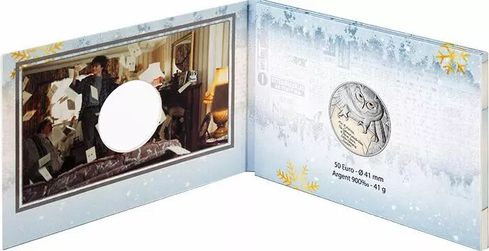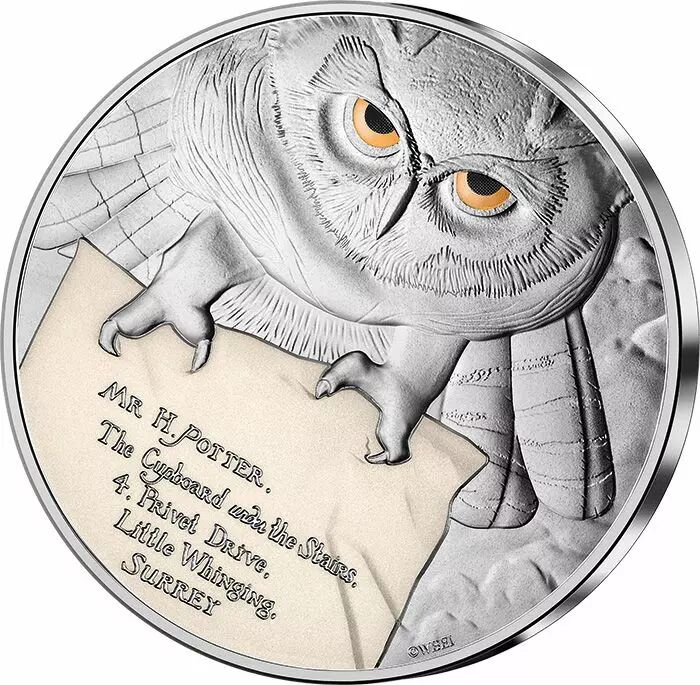 This coloured silver 50 coin features on its face an owl holding in its talons the letter of admission to Hogwarts School of Witchcraft and Wizardry. This letter is sent to young wizards on their 11th birthday and officially entitles them to enter the wizarding world. The letter shows the address of the Dursley family who took Harry Potter in shortly after his birth. As with the €10 silver coins, these are coloured using the pad printing technique.