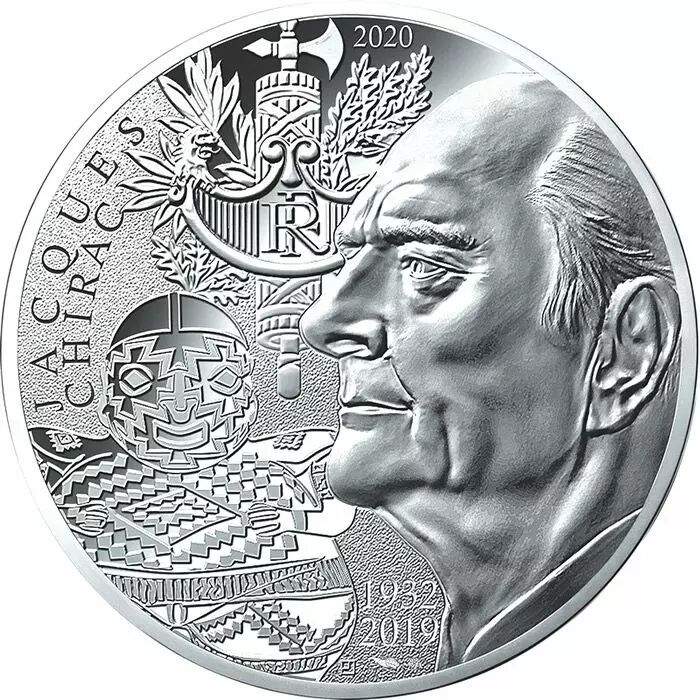 The €10 and €20 coins have identical sides. They depict the profile of Jacques Chirac. The solemn pose of the politician refers to the iconography of his election to the Presidency of the French Republic in 1995. Jacques Chirac is surrounded by symbols that have marked his history, such as his Seal, which refers to his two terms as President, and Chupicuaro, the emblem of the Musée du Quai Branly, which recalls his passion for primitive arts. The name "Jacques Chirac" and his dates can also be seen on the face of these coins.