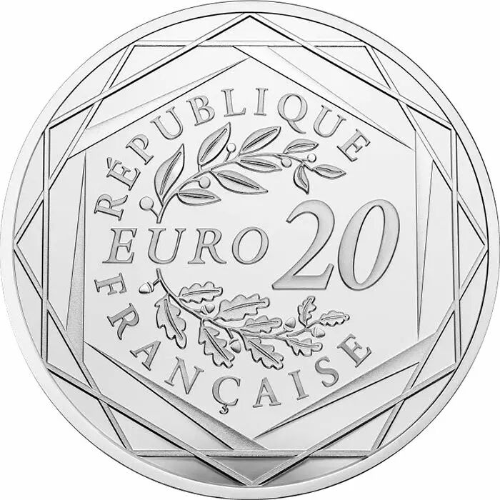 The 2020 vintage and the RF are at the top of the face. The reverse shows the face value surrounded by two branches, one of oak and the other of laurel, evoking the Euro symbol. The entire reverse design is framed by a series of lines representing the Hexagon. The 20-euro coin is made of silver 900‰ BE quality (Belle Épreuve). Minted in only 10,000 copies it weighs 18 grams and has a diameter of 33 millimetres.