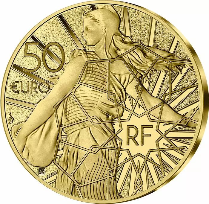 On the reverse is a modernized adaptation of the Sower by engraver Louis Oscar Roty, revealing a heraldic version of the French flag on the drape of her dress. The mention « RF » is also encircled by an intertwining of hexagons recalling France.