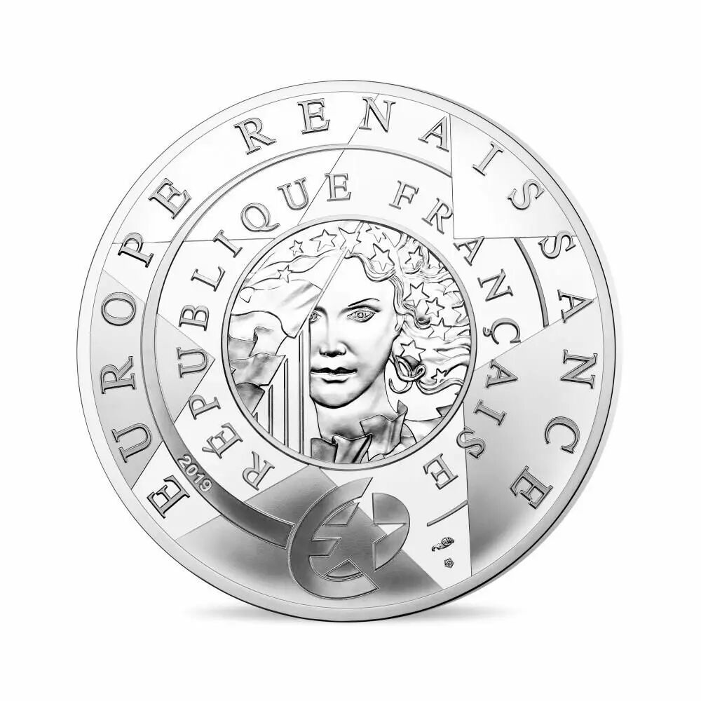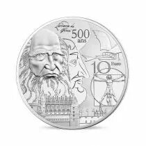 François I, who reigned for 32 years, is considered the emblematic king of the French Renaissance. He allowed a significant development of arts and letters in France. He was a great admirer of Leonardo da Vinci, to whom he entrusted various tasks such as the organisation of court festivities in Ambroise. It is therefore not surprising that these two emblematic men appear on this coin side by side.