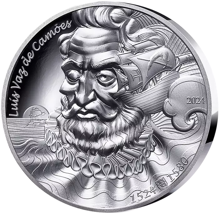 The obverse of this coin depicts Luís Vaz de Camões in profile, surrounded by waves and sea. There are many symbols referring to his maritime adventures: his ruff and hair turning into waves, the sailboat on the horizon, the caravel on his right. This caravel is adorned with Crosses of the Order of Christ, symbol of the Portuguese nation, and an emblem made of a feather and a sword, evoking the sixteen years that the author spent at sea and traveling in the Orient. His right eye, which he lost during a battle in Morocco at the age of 23, is closed.