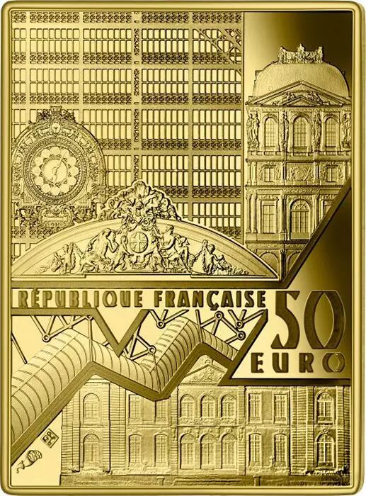 Reverse: The reverse of the coin depicts a set of architectural details from various French museums. The face value of 50 euros is indicated, as well as the year 2023.