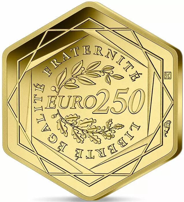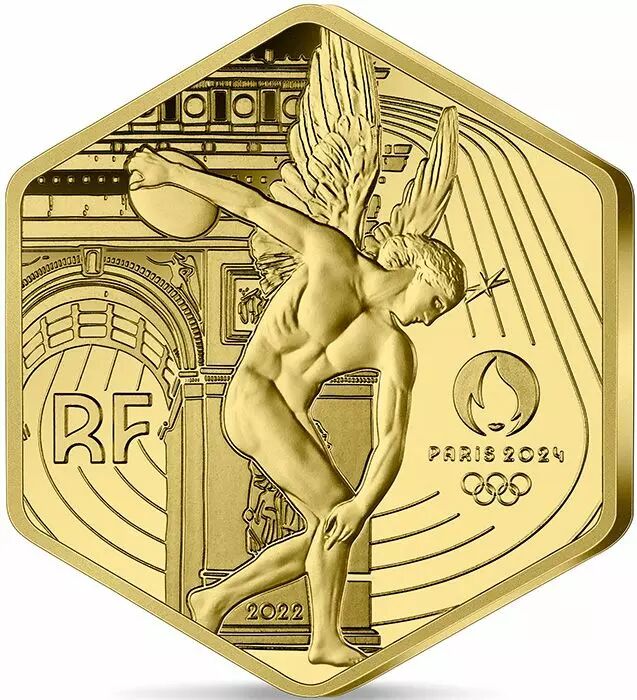 After Marianne the face of these coins features the Genie throwing a discus overlooking the athletics stadium of the Paris 2024 Olympic and Paralympic Games. The background also features the Arc de Triomphe, symbolising the city of Paris.