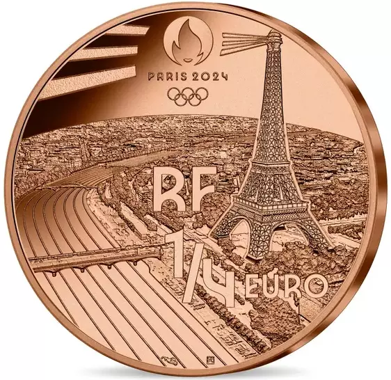 The reverse, common to the series since 2021, shows a view of Paris where the Seine takes on the appearance of an athletics track. The Eiffel Tower dominates the city and illuminates the competition.