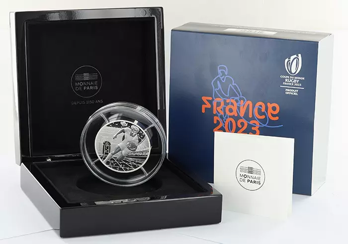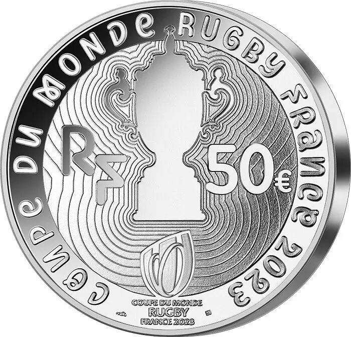 The reverse features the Webb Ellis Cup that the winner of the World Cup will have the joy of brandishing. To the left of the cup is the inscription RF, and to the right, the face value. The words "Rugby World Cup France 2023" appear all around the decor. Under the cup is the logo of the Rugby World Cup France 2023