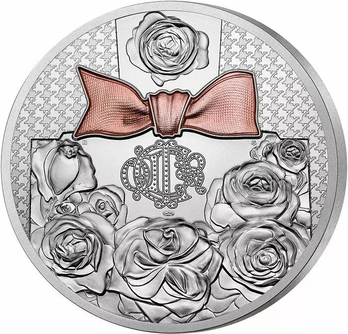 Continuing the series, this silver medal pays tribute to the codes of the House of Dior: the houndstooth, the roses and the couture knot. The intertwined letters DIOR, taken from an antique brooch produced by the fashion house, complete the central design. The knot is highlighted by a hand-coloured deposit that recalls the colour of the Miss Dior perfume juice.