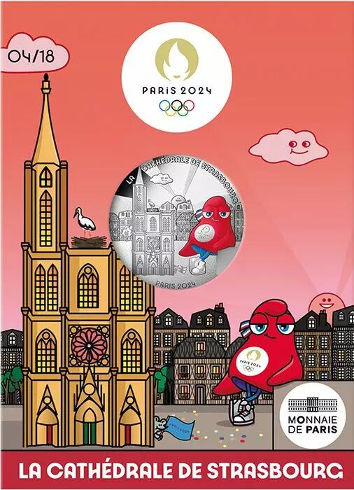 On this coin, leaning against a low wall, the mascot smiles mischievously. Nearby is Strasbourg cathedral, on which a stork has made its nest. In the background, half-timbered buildings typical of Alsace recall the architecture of the city.