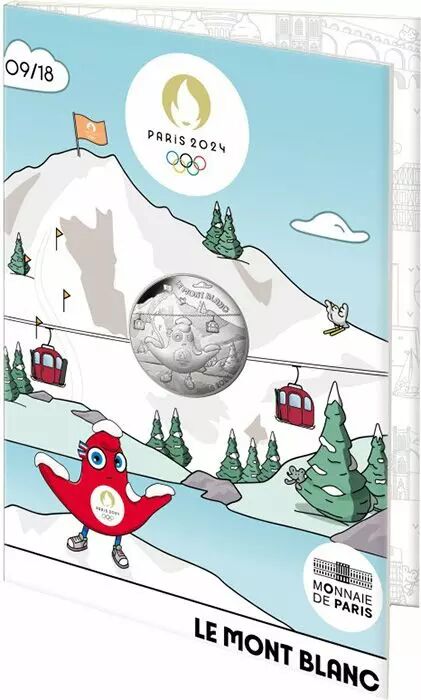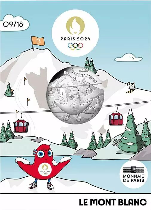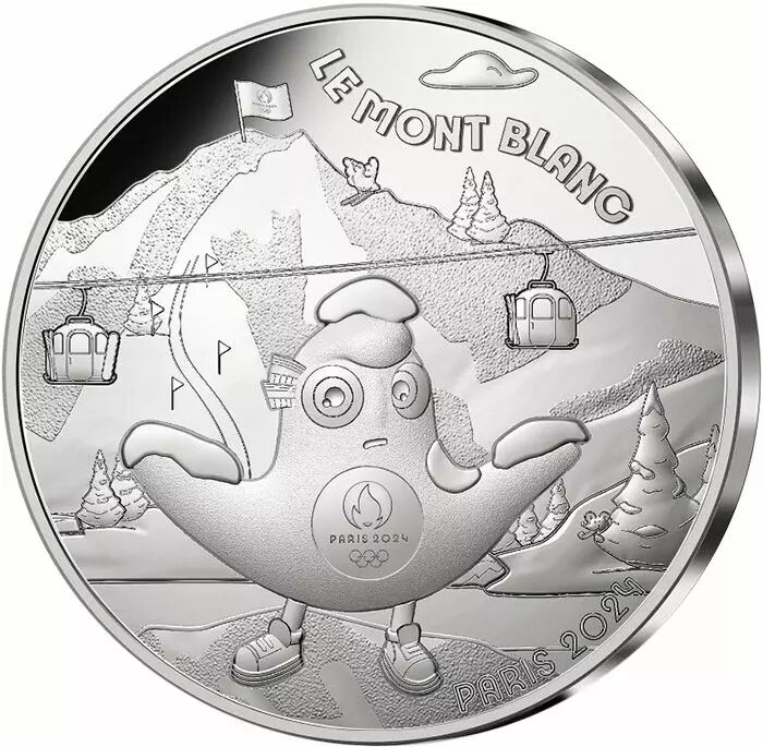 On this coin, covered in snow, the Olympic Games mascot has a bemused look on her face. Behind her, Mont Blanc is also full of snow, and the fir trees scattered at its foot and on its slopes are also decorated with snow. At the top of the mountain flies a flag bearing the Paris 2024 logo. Above the mascot is a cable with cable car cabins attached.
