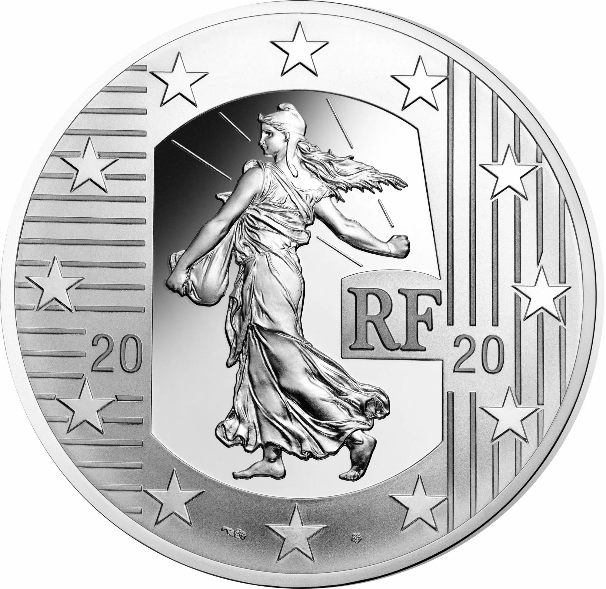 The face represents Roty's Sower in a more contemporary setting surrounded by the 12 stars of the European flag. The female figure is framed by the French flag in heraldry (horizontal lines for the blue, smooth lines for the white, vertical lines for the red) as well as the year of issue on either side of her legs. The different of the Monnaie de Paris and the Atelier de Gravure are located under the feet of the Sower and the mention RF under her right arm.