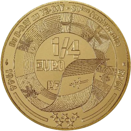 The reverse of this coin highlights all the Allied countries that officially participated in the Normandy landings surrounding the face value and the mention RF. Clockwise: Free France, Netherlands, New Zealand, Poland, Australia, United States, Norway, United Kingdom, Czechoslovakia, Canada, Belgium. The stars under the flags are also a tribute to the "Road to Freedom", kilometer markers marking the route followed by the 3rd American army for the liberation of France to Luxembourg.