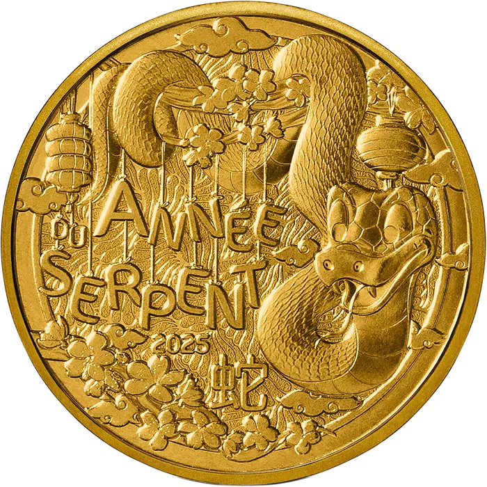 Surrounded by plum blossom, a symbol widely used in Chinese history and art, as well as lanterns, the snake is represented in a joyful and childlike way. The inscription "Year of the Snake" followed by the year 2025 appears in the center of the coin. The ideogram of the snake appears below. On the reverse, we find all the animals of the Chinese zodiac drawn in a childlike manner distributed around the symbol of Ying and Yang. From 2018 to 2029, a complete cycle of the Chinese zodiac is composed. Each of these twelve years highlights an animal from this calendar. The face value is visible in the center of the coin and the mention "RF".