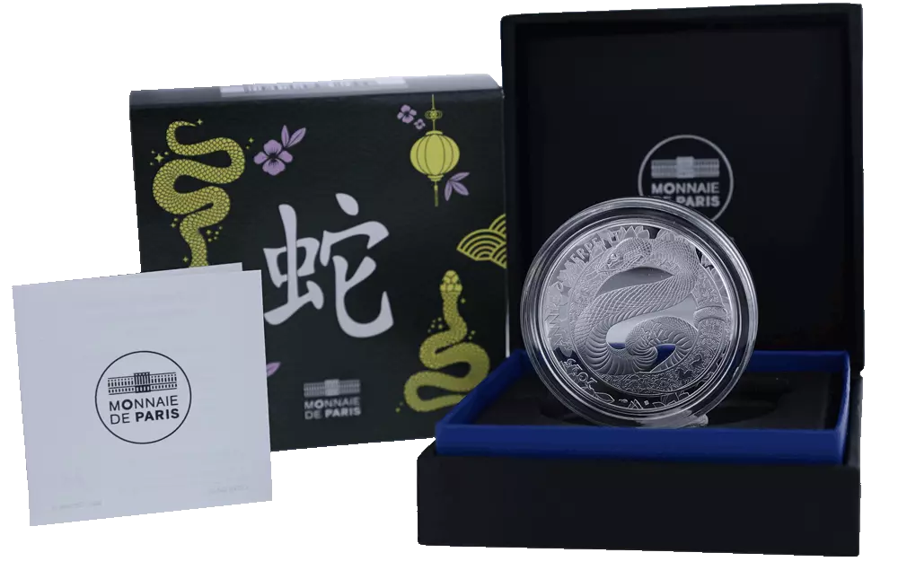 In the centre of the coin face, a snake undulates around a ring engraved with traditional Chinese motifs. The reptile is in motion, partly wrapped around the ring and seemingly ready to escape from the edges of the coin, which are decorated with orchids, the flower associated with this sign. The impression of calm that emanates from the representation of the snake refers directly to what is one of the main characteristics of the natives of this sign. The ideogram ?Serpent? appears on one of the curves of the body. The year 2025 and the inscription ?Year of the Snake? appear on the outline of the design.