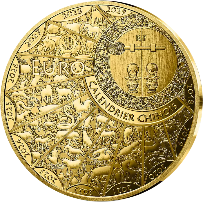 On the reverse, we find all the animals of the Chinese zodiac arranged on a screen surrounding a traditional temple gate. A complete cycle of the Chinese zodiac begins in 2018 and lasts until 2029. Each of these twelve years highlights an animal from this calendar. The face value is visible in the upper left and the mention «RF» is located on the door.