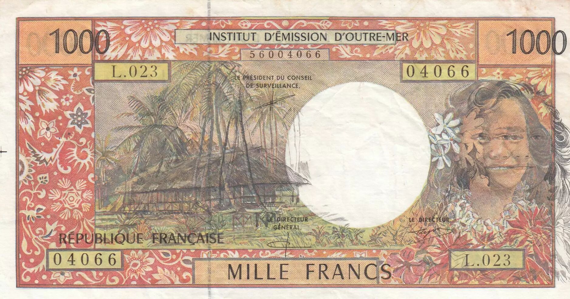 Banknote French Pacific Territories 1000 Francs Tahitian woman - Error note - Serial F.023