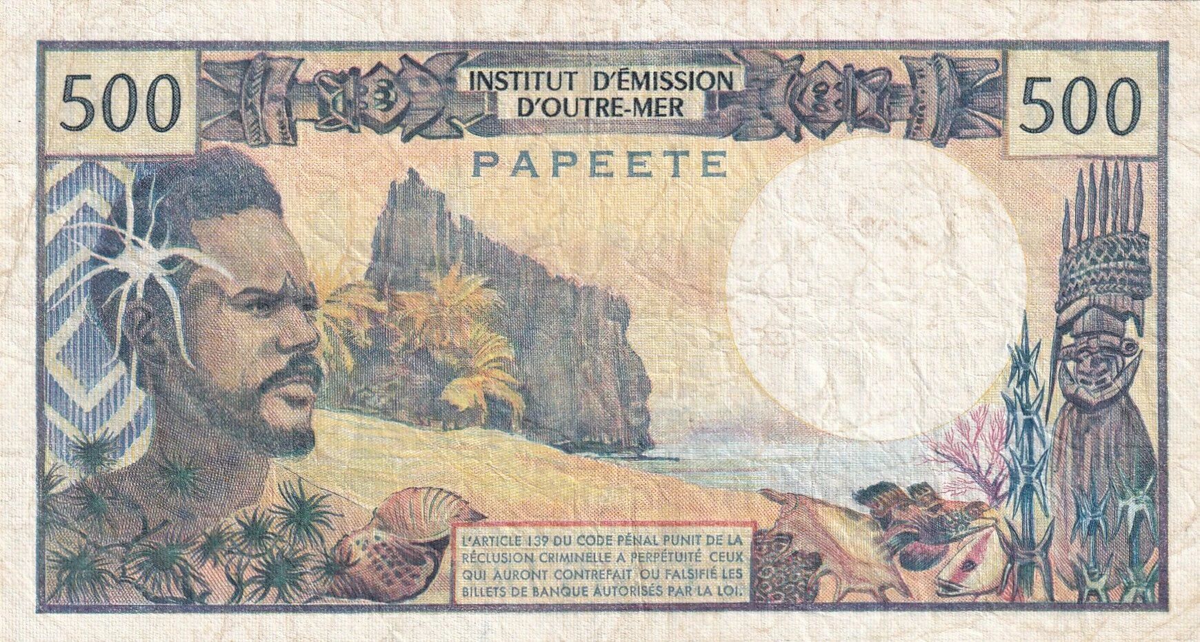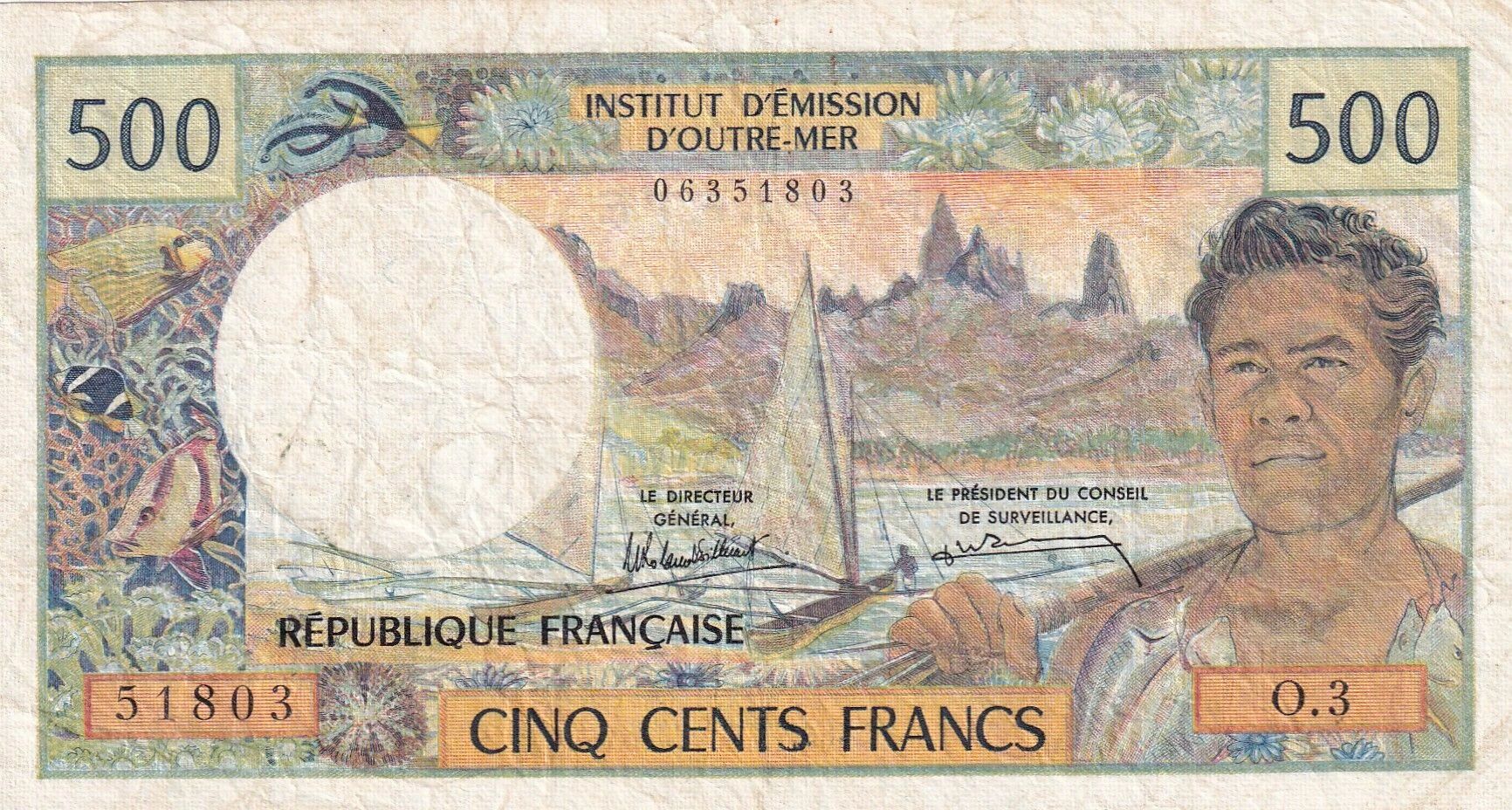 This banknote, with a face value of 500 francs, was issued in French Polynesia during the period from 1970 to 1992. It belongs to the O.3 series and has distinct visual characteristics on both sides.