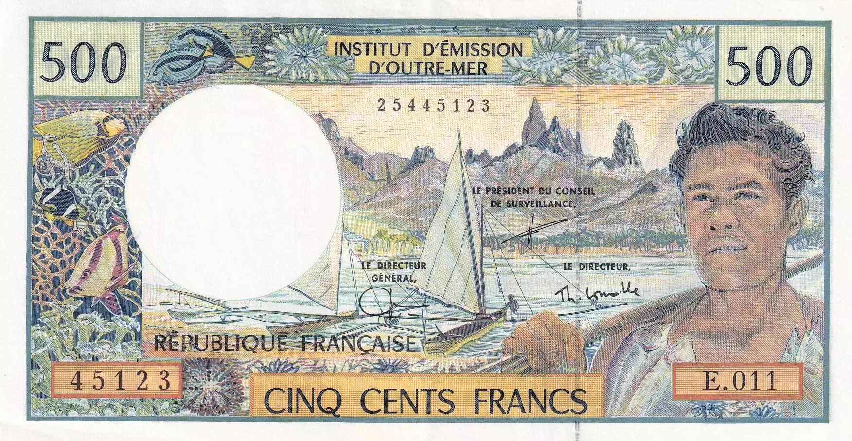 Home > > French Pacific Territories 500 Francs - Fisherman - Marquises Islands - ND (1992) - Serial E.011 - P.1e