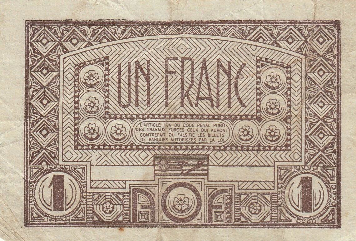 This 1 franc banknote, issued by the Bank of West Africa, dates back to 1944. It is part of a series of emergency banknotes issued during the Second World War period. It features a distinctive geometric artistic design.