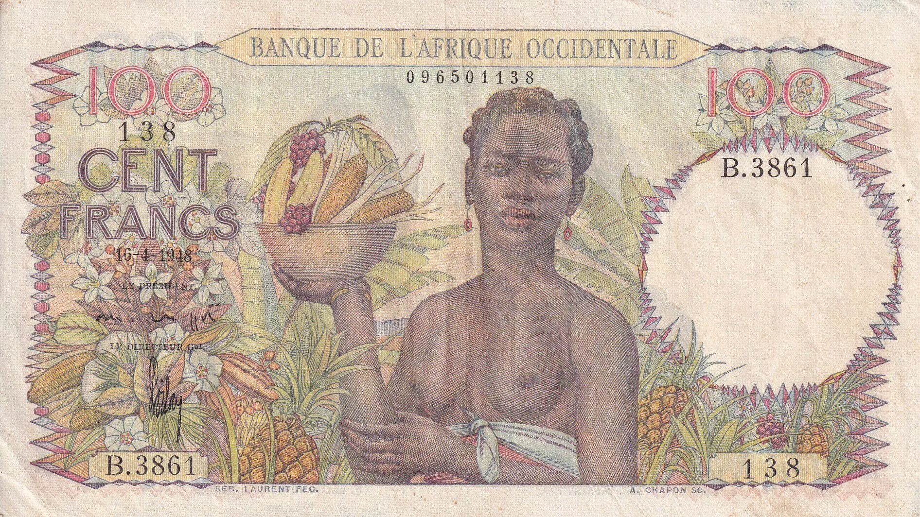 Banknote French West Africa 100 Francs - African, pineapple - Family - 16-04-1948 - Serial B.3861 - VF - P.40