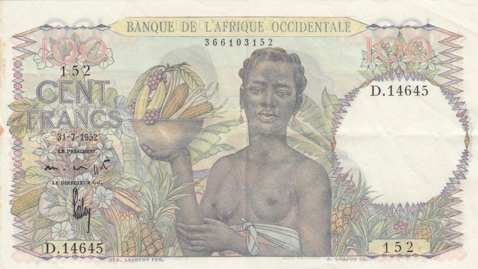 This banknote is issued by the Banque de l'Afrique Occidentale (B.A.O.) and has a face value of 100 francs. The issue date of this note is 1952.