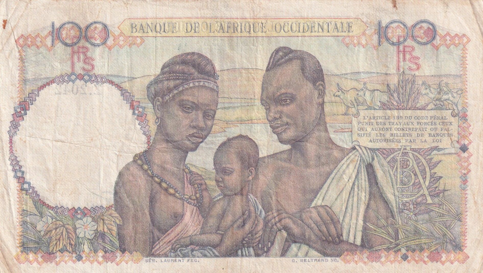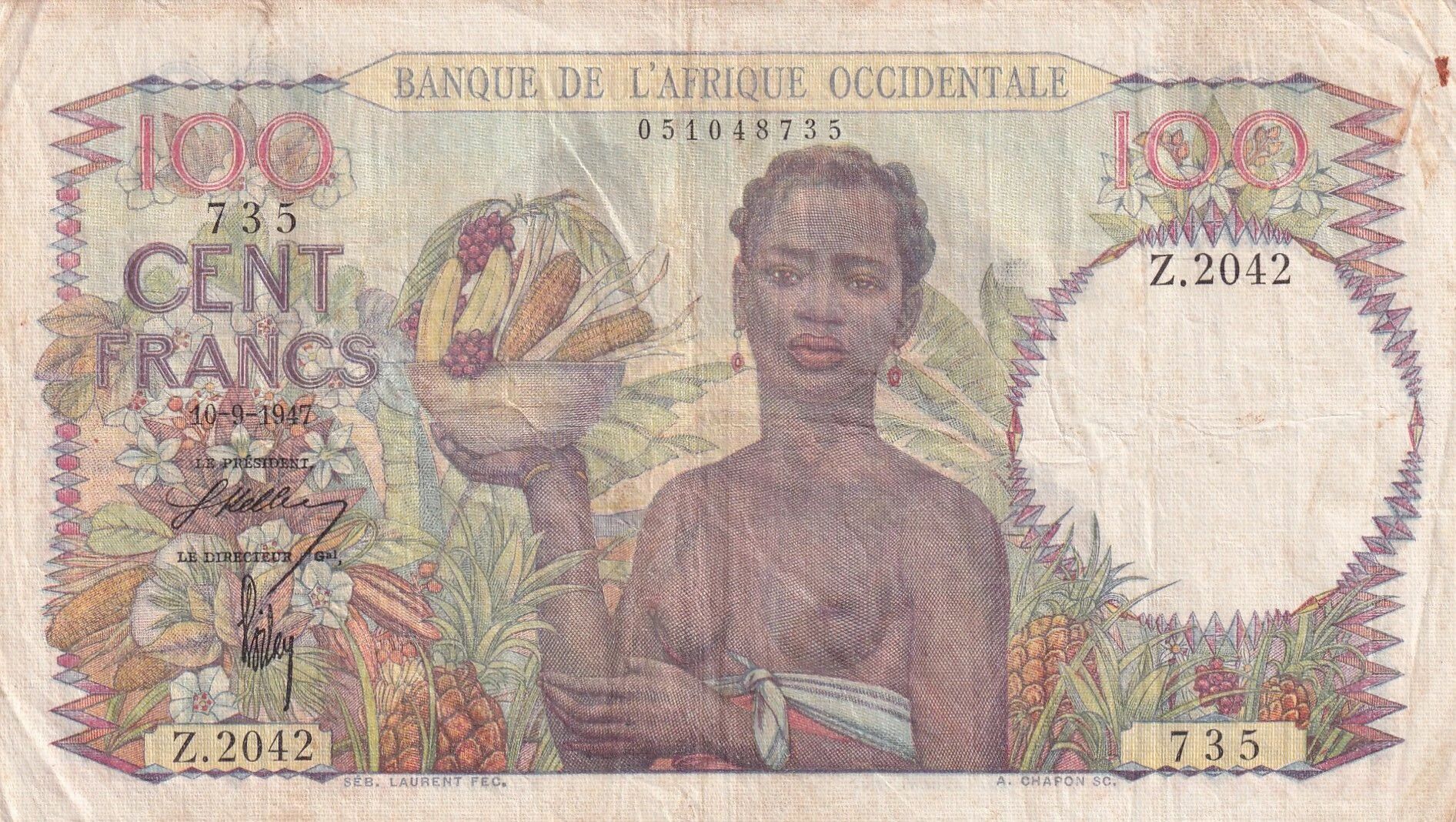 On the obverse, there is a representation of a woman carrying a bowl of fruit. The inscriptions in Latin include "100 FRANCS BANQUE DE L'AFRIQUE OCCIDENTALE 100", "CENTS FRANCS", and "50 INSTITUT D?ÉMISSION DE L'A.O.F. ET DU TOG". We also read "SÉB. LAURENT FEC. A. CHAPON SC.", indicating the names of the artists involved in its creation. Auguste Chapon is identified as the engraver and Sébastien Laurent as the designer.