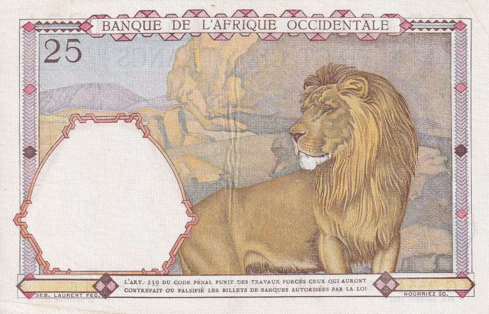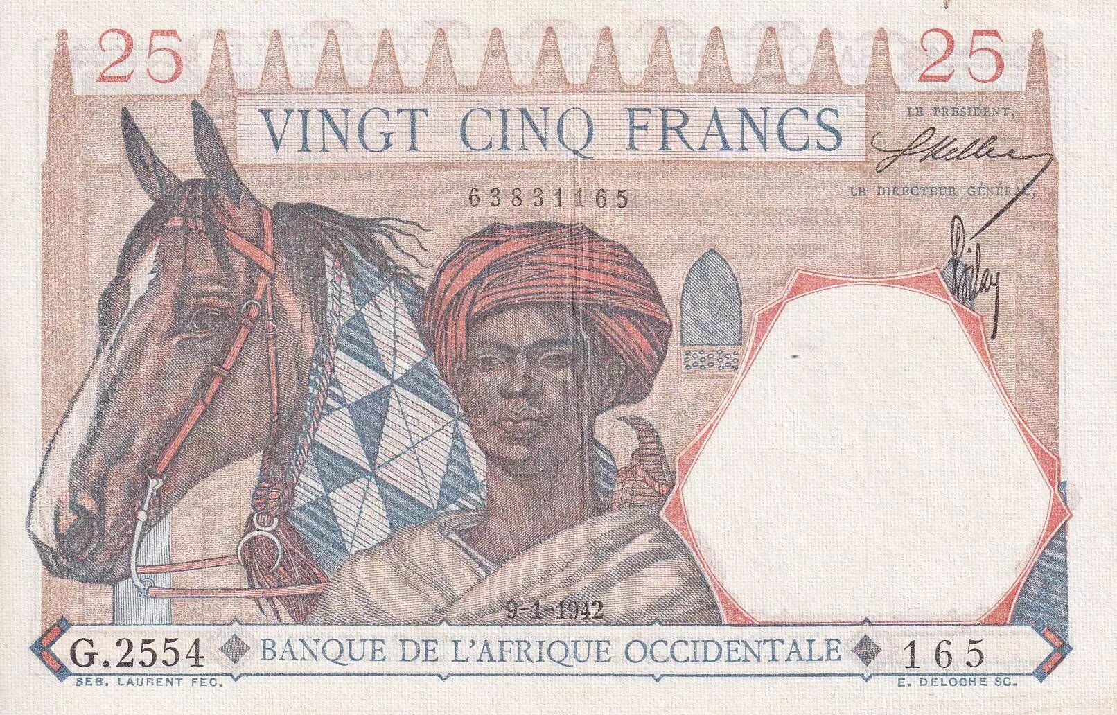 Home > > French West Africa 25 Francs - Man and horse, Lion - Red numerals - 1942 - Serial G.2554 - XF - P.27