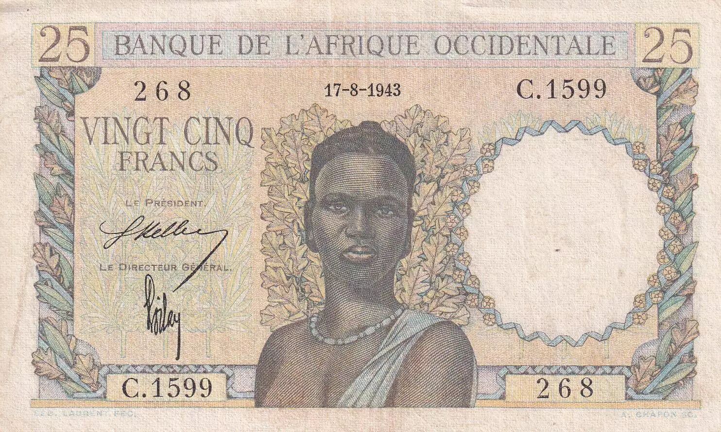 Home > World Banknotes > African Banknotes > Bank of West Africa > French West Africa 25 Francs - Woman, Man with a cow - 1943 - Serial C.1599 - VF+ - P.38