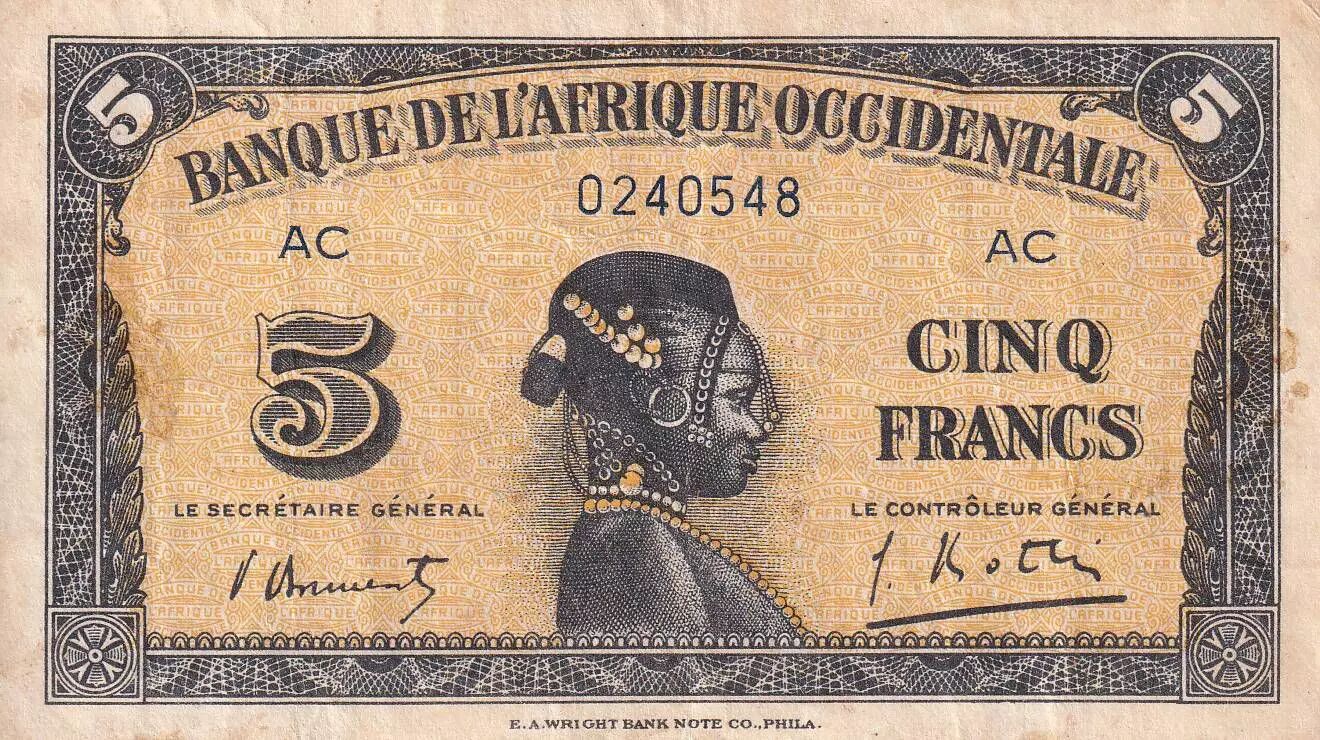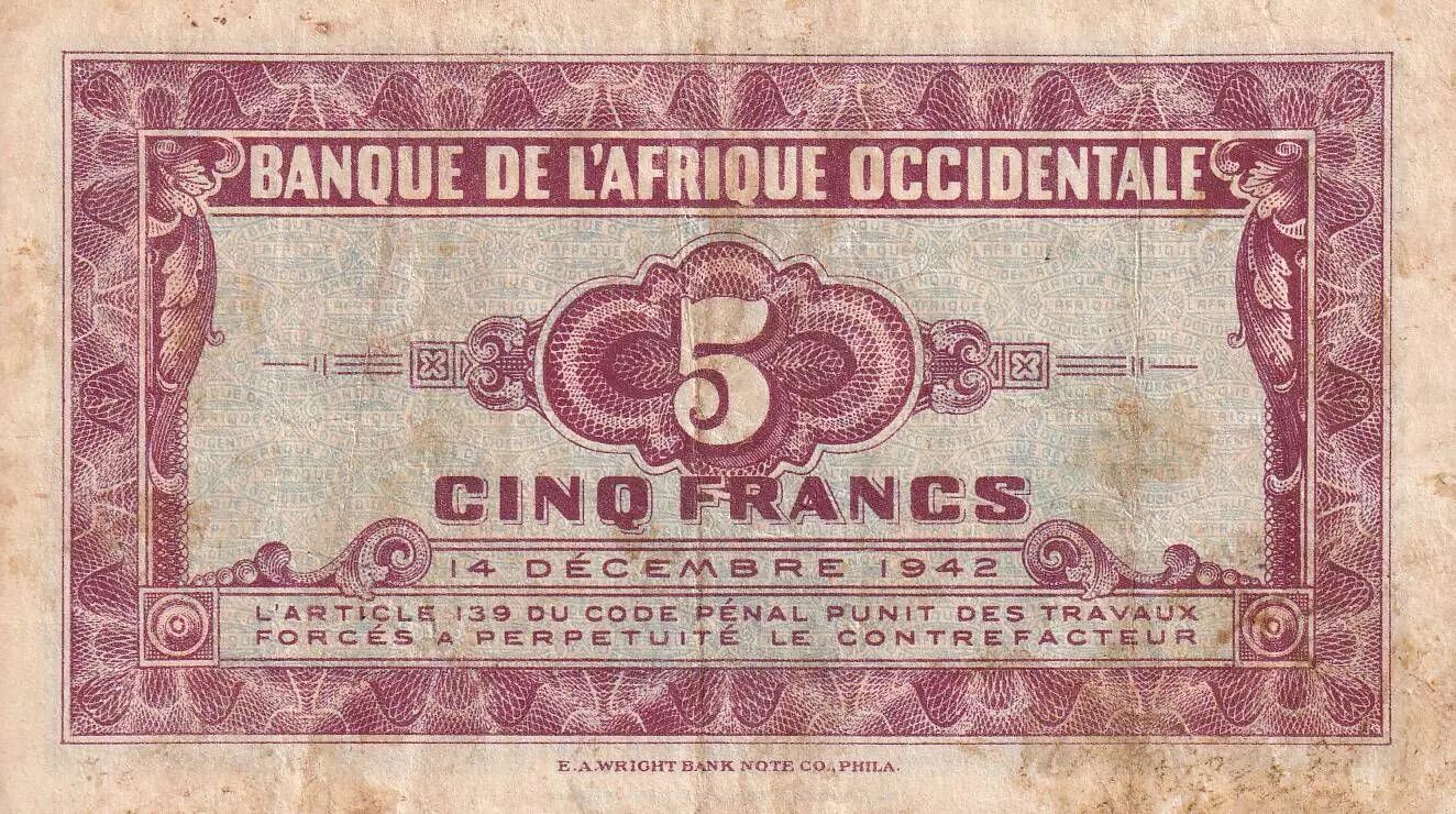 Home > > French West Africa 5 Francs - African - 1942 - F+ - Serial AC - P.28b