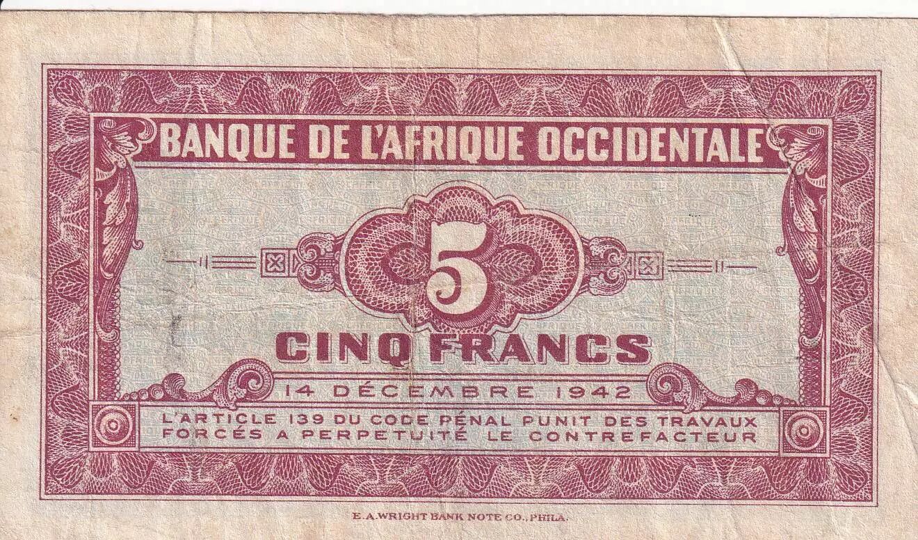 Banknote French West Africa 5 Francs - African - 1942 - F - Serial U - P.28a