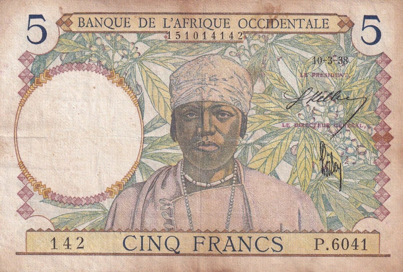 The obverse of the banknote features a male human figure positioned in the center. The inscriptions "Banque De L'Afrique Occidentale" and "Cinq Francs" are also present.