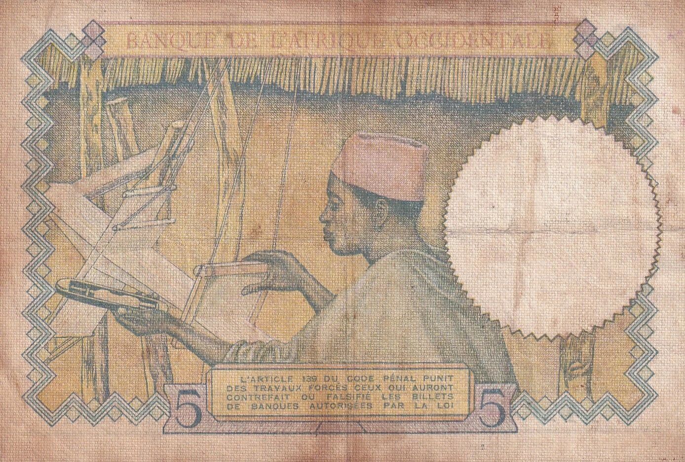 The banknote's watermark represents a man's head. The face value of the banknote is five francs. The issuing country is French West Africa (AOF), as indicated by the abbreviation B A O in the product data. The banknote illustrates an aspect of African life and craftsmanship of the time, particularly through the representation of weaving.