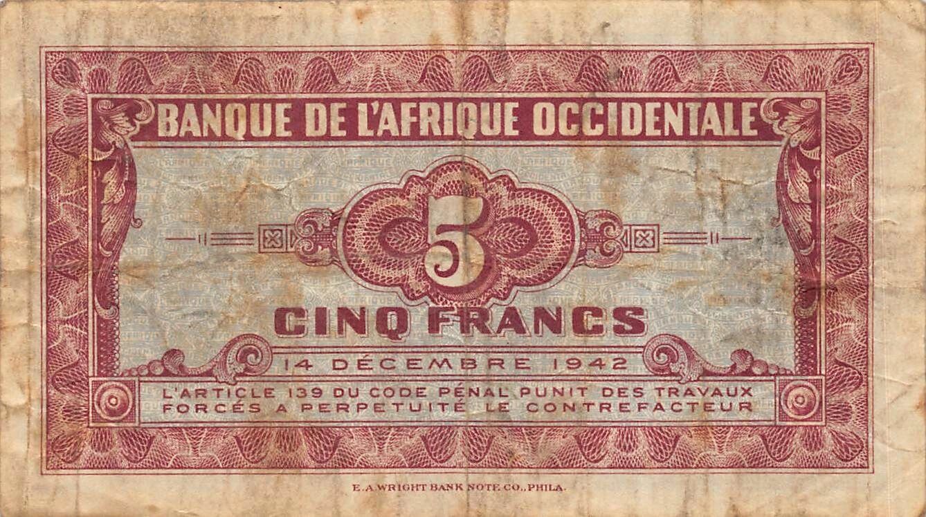 Home > World Banknotes > African Banknotes > Bank of West Africa > French West Africa 5 Francs - African woman - 14-12-1942 - P.28a