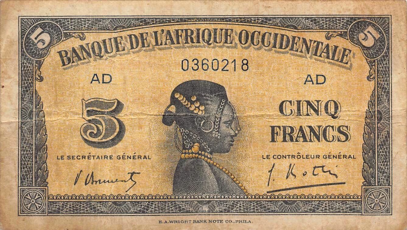Home > World Banknotes > African Banknotes > Bank of West Africa > French West Africa 5 Francs - African woman - 14-12-1942 - P.28b