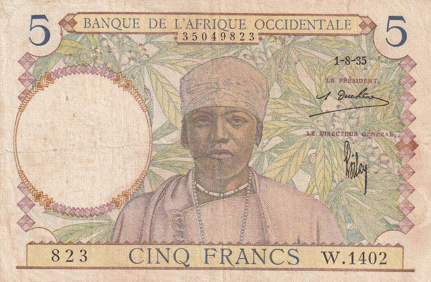 Home > World Banknotes > African Banknotes > Bank of West Africa > French West Africa 5 Francs - Coffe tree - Man weaving - 01-08-1935 - Serial W.1402 - P.21