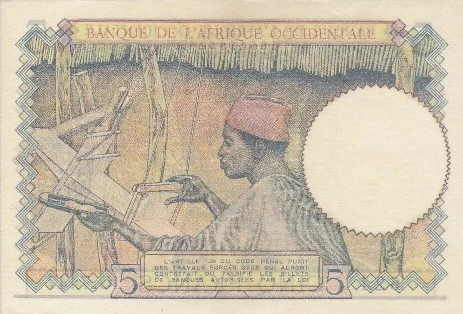 Banknote French West Africa 5 Francs - Coffe tree - Man weaving - 06-03-1941 - Serial G.7447
