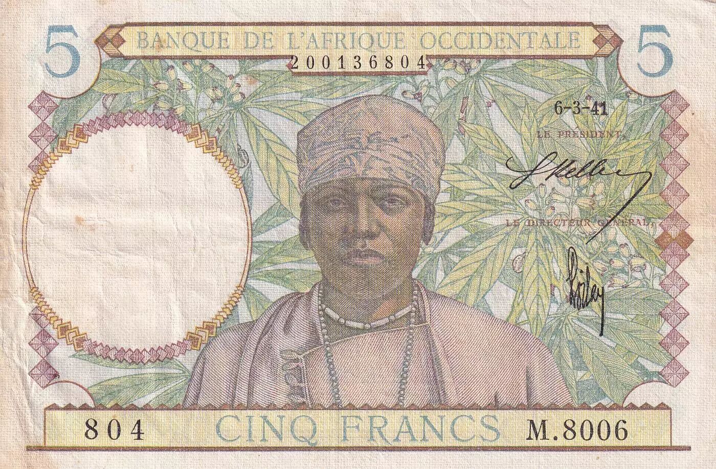 Home > > French West Africa 5 Francs - Coffe tree - Man weaving - 06-03-1941 - Serial M.8006- VF+ - P.21