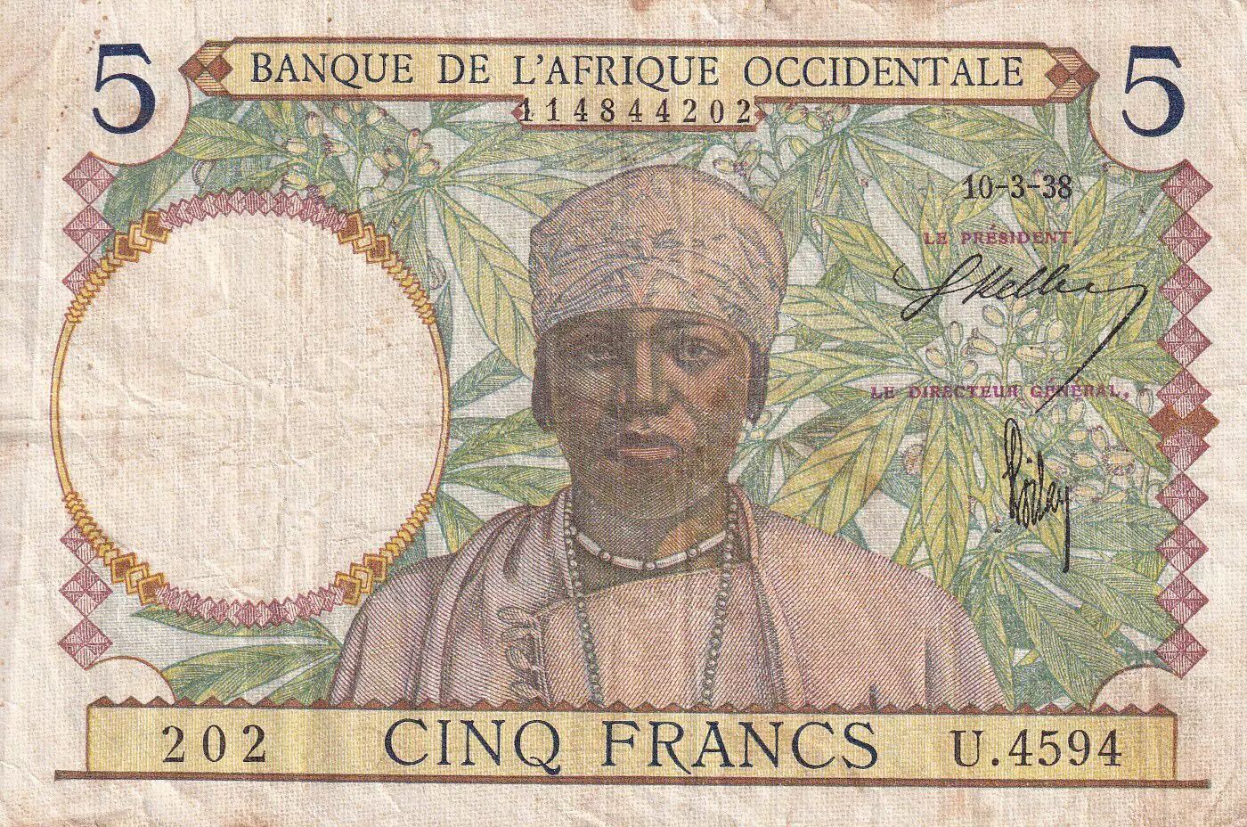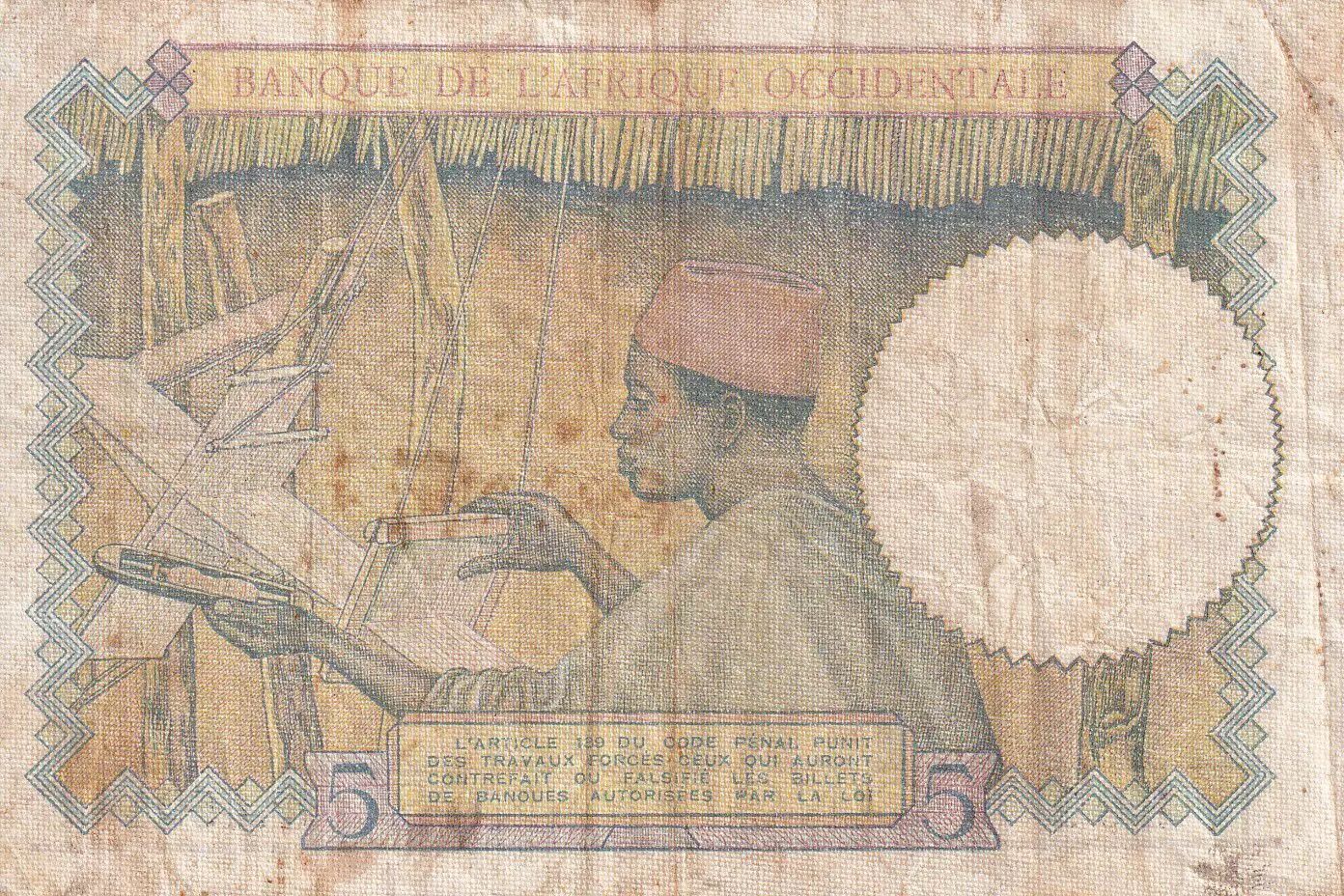 Home > > French West Africa 5 Francs - Coffe tree - Man weaving - 10-03-1938 - Serial U.4594 - P.21