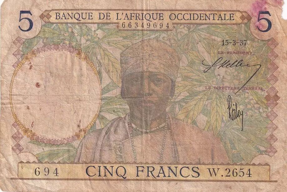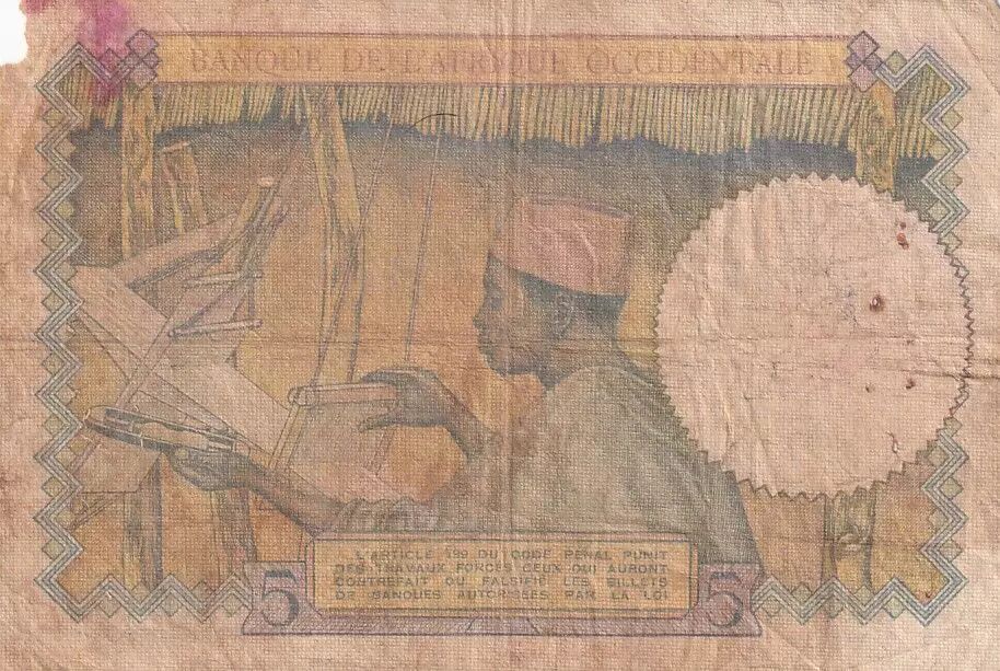 Home > > French West Africa 5 Francs - Coffee tree - Man weaving - 15/03/1937 - Serial W.2654 - F - P.21