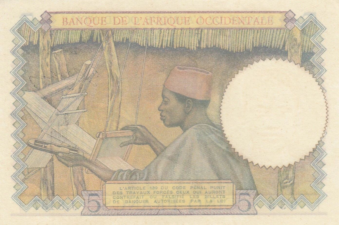 The 5 Francs banknote from the Banque de l'Afrique Occidentale, issued on April 22, 1942, features distinct visual characteristics on both sides.
