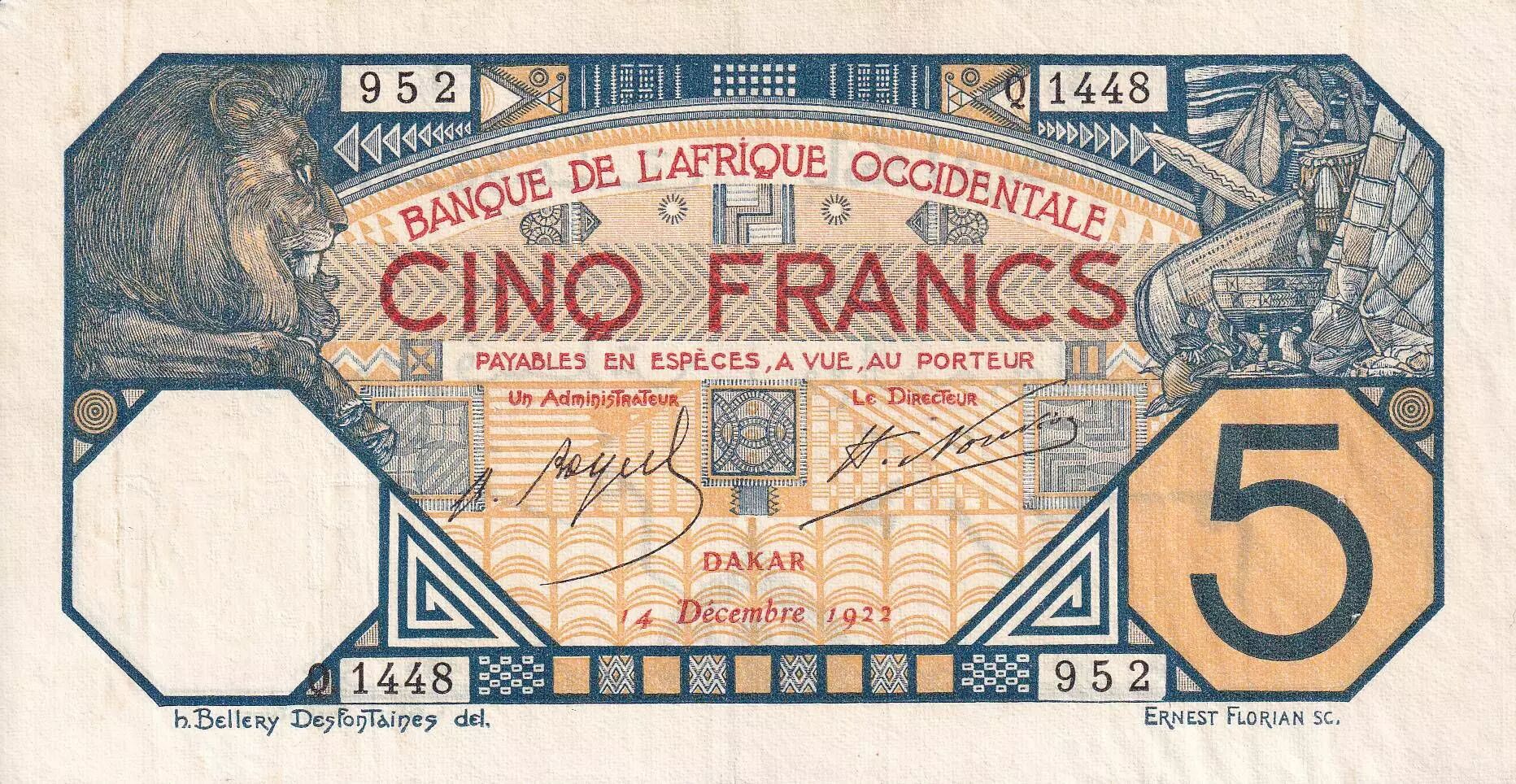 Home > World Banknotes > African Banknotes > Bank of West Africa > French West Africa 5 Francs - Dakar - 14-12-1922 - Serial O 1448 - VF+ - P.5Be