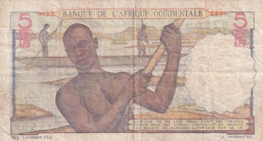 Banknote French West Africa 5 Francs - Woman, fishermen - 17-08-1943 - Serial T.33