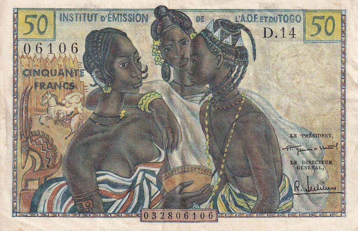 Home > > French West Africa 50 Francs - AOF and Togo - Women, dancer, harbor - 1956 - Serial D.14 - VF - P.45