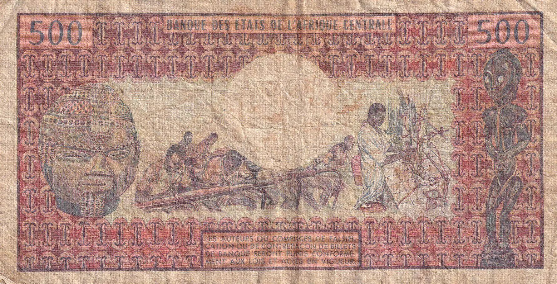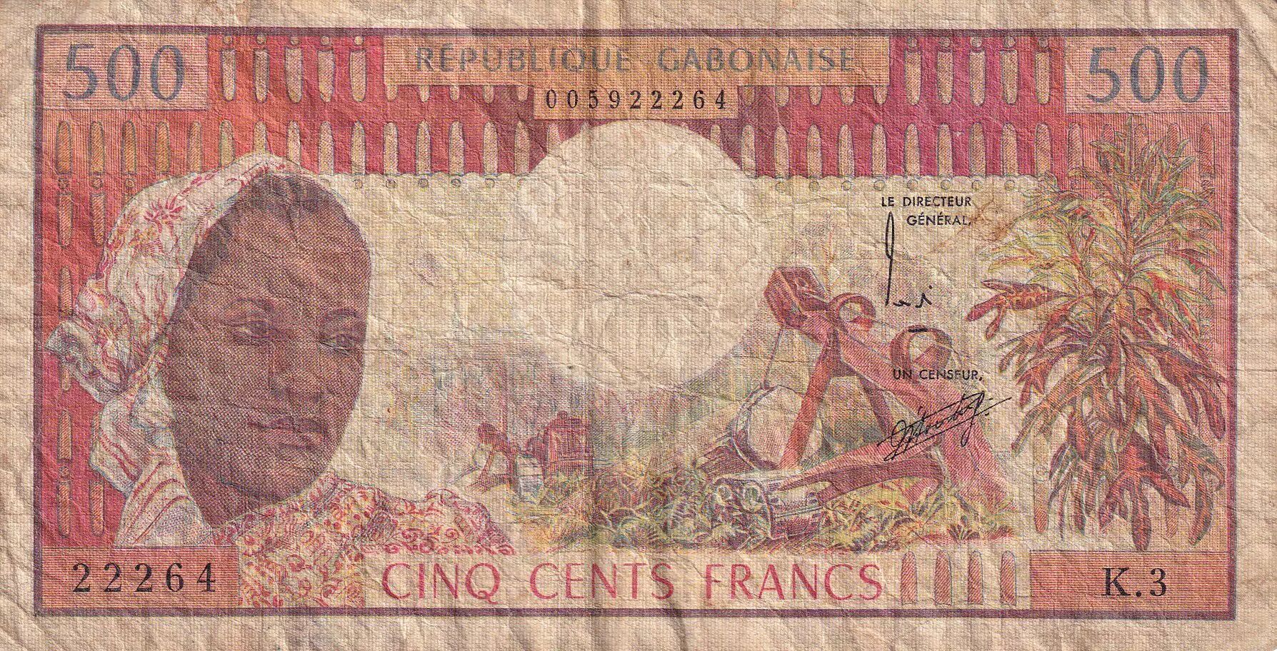 Banknote Gabon 500 Francs -Woman, wood - students - 1974 - Serial K.3 - P.2a