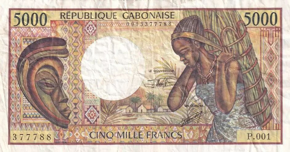 Accueil > Billets du Monde > Billets d'Afrique > Gabon > Gabon 5000 Francs masque, jeune femme - 1983-1991 - Série P.001-377788