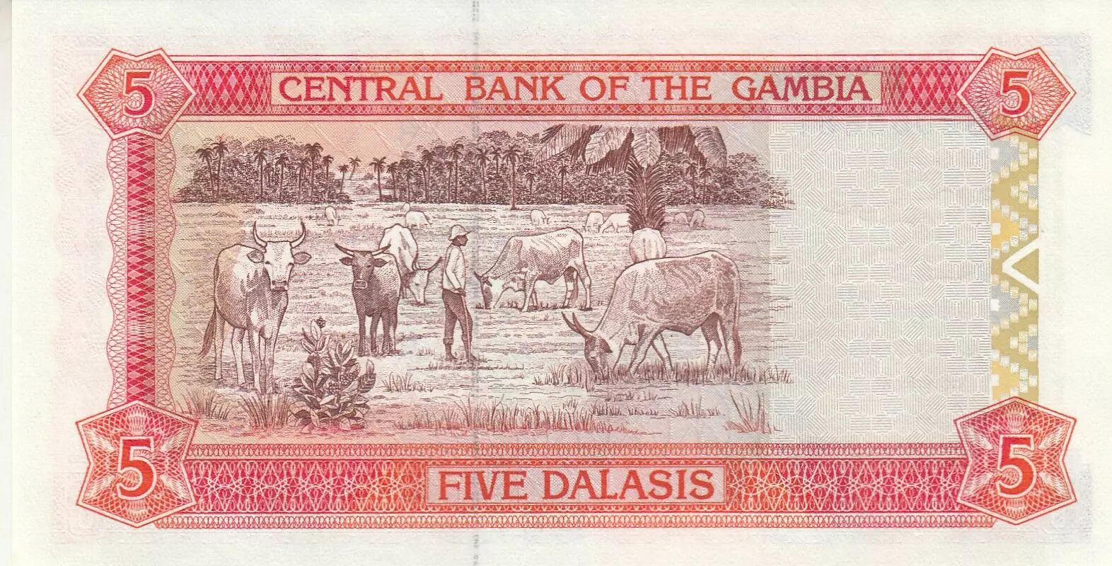 Le verso du billet est imprimé en rouge et brun. L'image centrale représente des bovins positionnés sur la gauche. Les inscriptions, également en latin, répètent le nom de la banque centrale, "CENTRAL BANK OF THE GAMBIA", ainsi que la valeur nominale, "FIVE DALASIS".